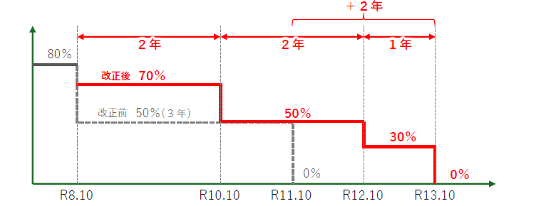 免税事業者など適格請求書発行事業者以外の者から行った課税仕入れにつき、その一定割合を控除できる経過措置について、適用期限を2年間延長した上で、以下のとおり控除可能割合が見直されました。